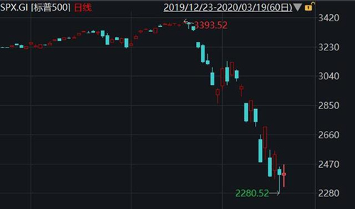 美股熔斷基準指數(shù)標普500日K線走勢圖。
