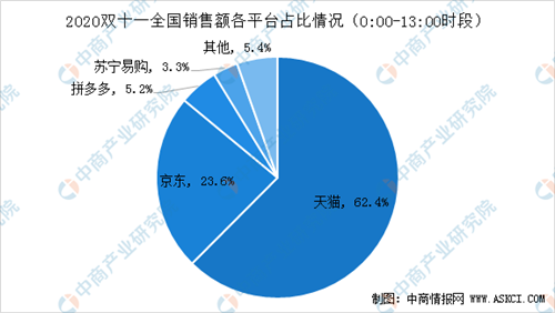 從各大電商平臺來看,在這個(gè)時(shí)間段,主場作戰(zhàn)的天貓銷售額占全網(wǎng)銷售額的62.4%,京東、拼多多、蘇寧易購分別以23.6%、5.2%和3.3%的占比位居其后。