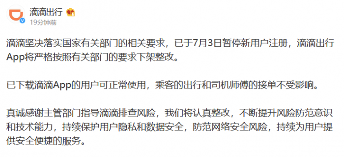 滴滴堅(jiān)決落實(shí)國家有關(guān)部門的相關(guān)要求,已于7月3日暫停新用戶注冊,滴滴出行App將嚴(yán)格按照有關(guān)部門的要求下架整改。已下載滴滴App的用戶可正常使用,乘客的出行和司機(jī)師傅的接單不受影響。