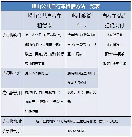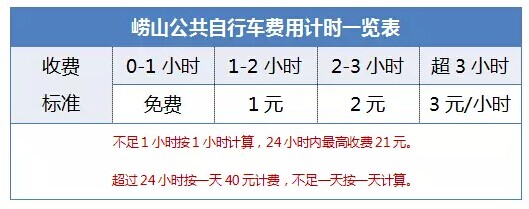注:持嶗山登山年卡的市民,在辦理并預(yù)存過金額之后,使用公共自行車時可享受5小時內(nèi)免費(fèi)的優(yōu)惠政策,5小時后,按普通自行車租賃卡的收費(fèi)標(biāo)準(zhǔn)計(jì)費(fèi)。